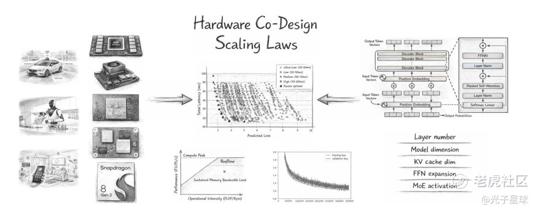 需要指出的是,理想汽车的协同设计并非一项技术,而是一种研发范式,或者说是一套数学框架理论。这项工作提出了一种面向车载与边缘场景的大语言模型硬件协同设计方法,通过结合损失函数扩展法则和Roofline性能建模,实现模型精度与推理延迟的联合优化。