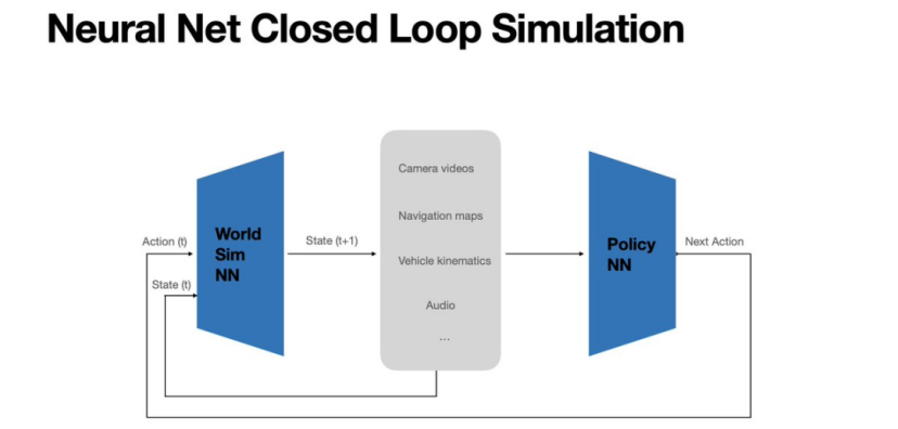 这一整体框架几乎就是端到端大模型与世界模型的融合,为此,特斯拉还开发了一个“神经世界模拟器”,用于根据当前状态与下一步动作生成未来状态,从而进行端到端大模型的性能评估。