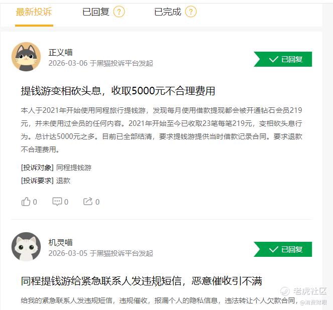 首先是其存量业务的用户投诉依然存在。在黑猫投诉平台上,关于同程旅行自营的“提钱游”产品涉及“不合理收费”、“不当催收”等问题并未完全消失。这些历史遗留问题,虽然已经属于过往,但却在持续侵蚀用户对企业的信任,更可能影响同程新业务的口碑重建,这一方面不容忽视。