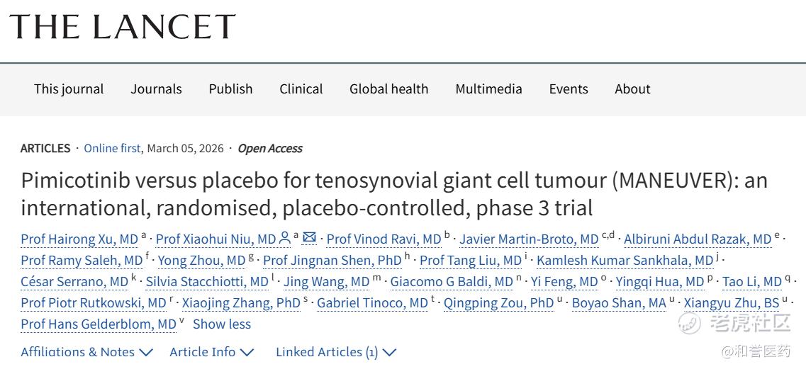 2026年3月9日,上海和誉生物医药科技有限公司(以下简称“和誉医药”,港交所代码:02256.HK)宣布,其自主研发的CSF-1R高选择性小分子抑制剂贝捷迈®(盐酸匹米替尼胶囊)全球多中心III期MANEUVER研究结果,于西欧时间3月5日正式发表在国际知名医学期刊《柳叶刀》(The Lancet)[1]。该论文的发表,标志着和誉医药这一创新疗法在临床研究质量、数据完整性及国际学术认可度方面迈上新的台阶。 $和誉-B(02256)$