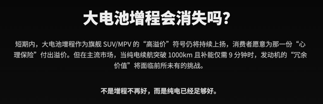 大电池增程,因为规划的原因,可能还会上的疯狂,因为车企都看到这波旗舰SUV和MPV的溢价,但是我们可能看到这部分市场是消费者自愿付出溢价,增程车的市场份额,在未来2-3年还会持续上扬。