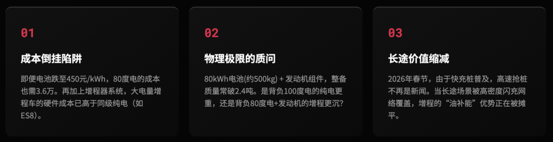 发动机需要定期保养、油箱占据空间、增加重量,最重要的是增程本身就是保险用的,在“纯电已经够用”的前提下,变成了纯粹的反向buff。