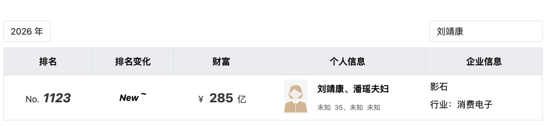 值得注意的是,尽管其下半年股价回落明显,但其创始人的财富造富效应却凸显。根据胡润研究院最新发布的《2026胡润全球富豪榜》显示,影石创新的刘靖康以285亿元人民币财富新晋上榜,全球排名第1123位。
