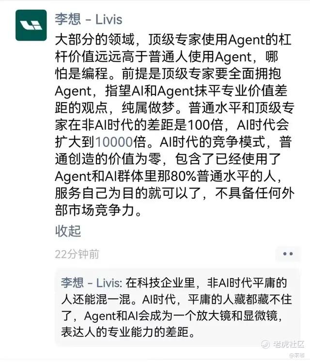 前不久理想汽车创始人兼CEO李想在朋友圈发文谈及AI与Agent对专业能力的影响时表示,在非AI时代,普通水平与顶级专家之间的差距可能是100倍;而在AI时代,这种差距或将扩大至10000倍。Agent和AI将成为“放大镜和显微镜”,放大人与人之间的专业能力差异。