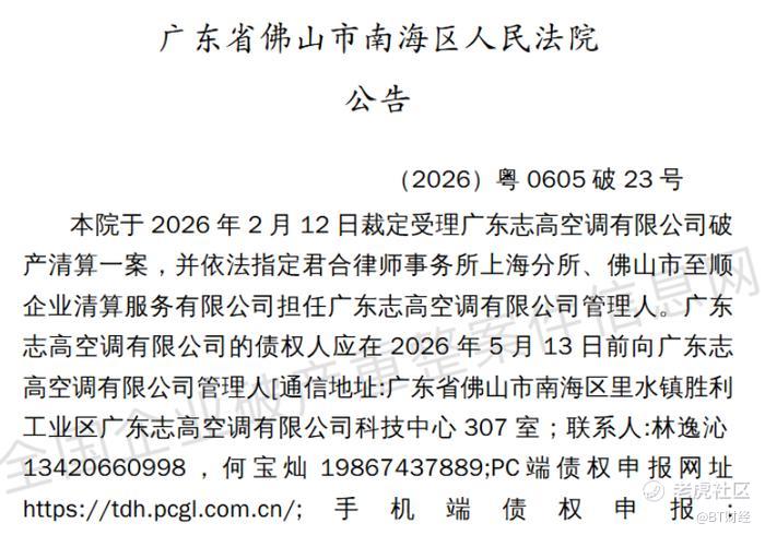 公开资料显示,广东志高空调有限公司注册资本99614万元,目前核心资产包括佛山市南海区里水镇3处合计8.23万平方米的不动产,以及690枚商标、271项专利,根据法院公告,这些资产将由管理人依法处置用于清偿债务。本次破产清算申请人为上海栎钐企业管理有限公司,法院已指定君合律师事务所上海分所与佛山市至顺企业清算服务有限公司共同担任管理人。