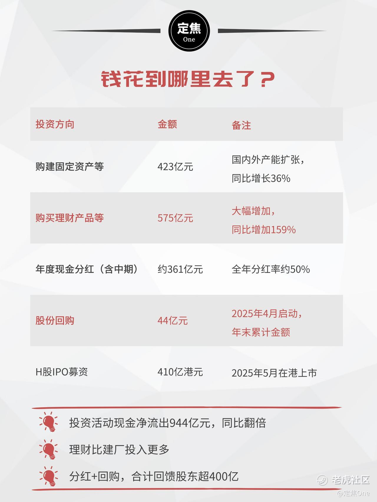这笔钱的大头,一是产能扩张:购建固定资产等支出423亿元,同比增长36%,国内外多个生产基地同步推进,在建产能321 GWh;二是购买理财产品:投资支出575亿元,同比增长159%。