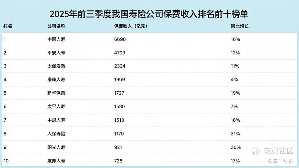 不过,中国人保虽然在财险领域有无可比拟的优势,但寿险业务却始终不温不火,在头部人身险公司中竞争力不足,保费多年里长期处在行业第八。2025年前三季度,人保寿险原保险保费收入首次突破1100亿,达1169.63亿元,同比增长21.05%,增速非常快,在前十名中仅次于阳光人寿。