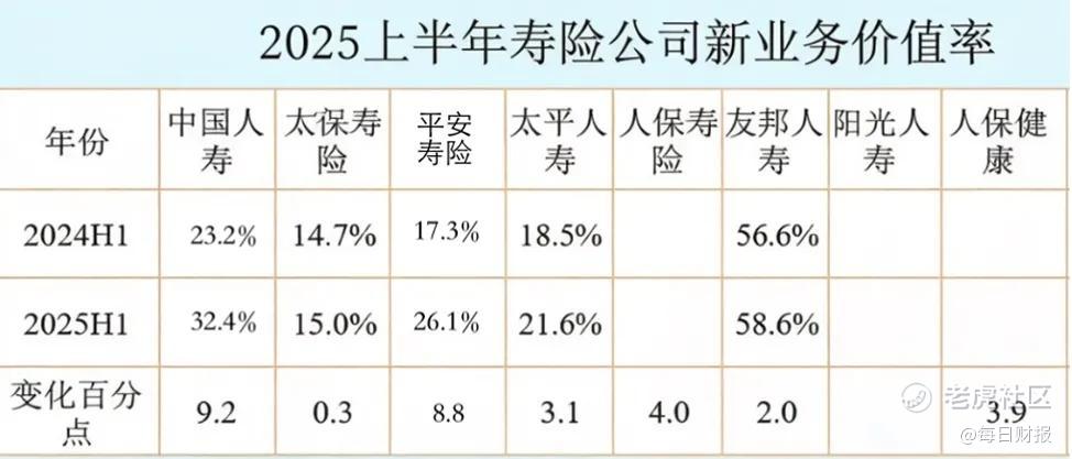 另外,在衡量未来盈利能力的新业务价值率指标上,人保寿险相对于其他头部公司,也有一定差距。根据中国人保2025年中期业绩发布会披露的信息,人保寿险2025年上半年新业务价值率(可比口径)同比提升4.0个百分点。不过,公司未在公开报告中直接披露该比率的具体数值。