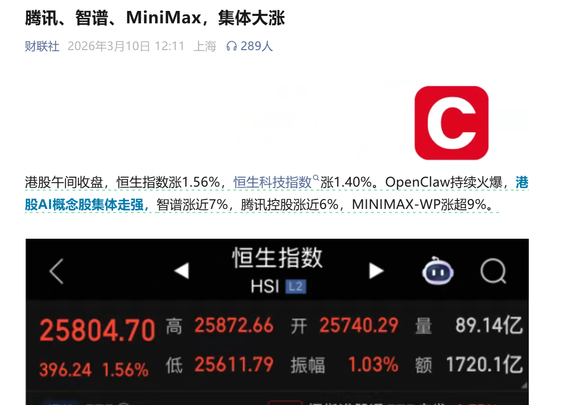 OpenClaw创始人的一条推文,直接带动 $MINIMAX-WP(00100)$ 持续破顶,突破1000港元。Peter Steinberger搞了一个PinchBench专门测各家大模型在龙虾上跑的表现,而Minimax以“高性价比”脱颖而出。现在应该没有人还没听说过“养龙虾”吧,AI从“聊天机器人”升级为“数字员工”,关注一下 Token消耗、算力需求、云基础设施、AI终端设备 这个增长周期的叙事~[可爱]