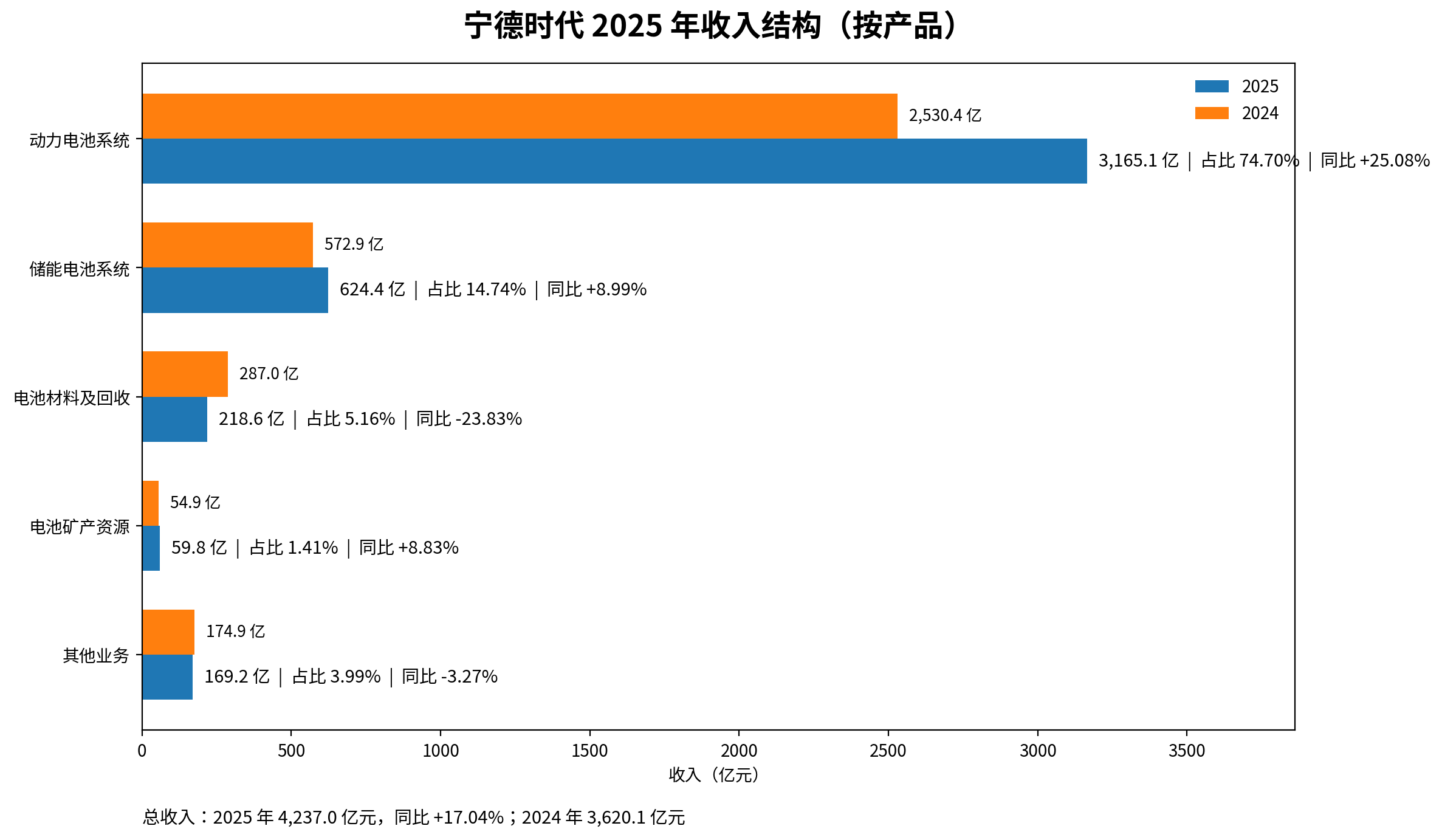 先看最直接的结果。宁德时代2025年实现营业收入4237.02亿元,同比增长17.04%;归母净利润722.01亿元,同比增长42.28%;扣非归母净利润645.08亿元,同比增长43.37%;经营活动现金流净额1332.20亿元,同比增长37.35%。这组数据本身已经足够强,尤其是利润增速明显快于收入增速,说明业绩来源不只是“卖得更多”,盈利释放也更充分。