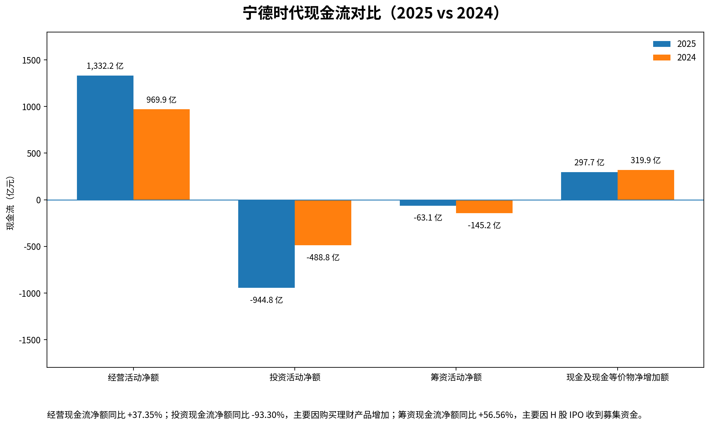 宁德时代2025年经营活动现金流净额达到1332.20亿元,期末总资产9748.28亿元,同比增长23.92%;归母净资产3371.08亿元,同比增长36.52%。利润不是停留在账面,而是比较充分地转化成了现金流和资产负债表的改善。
