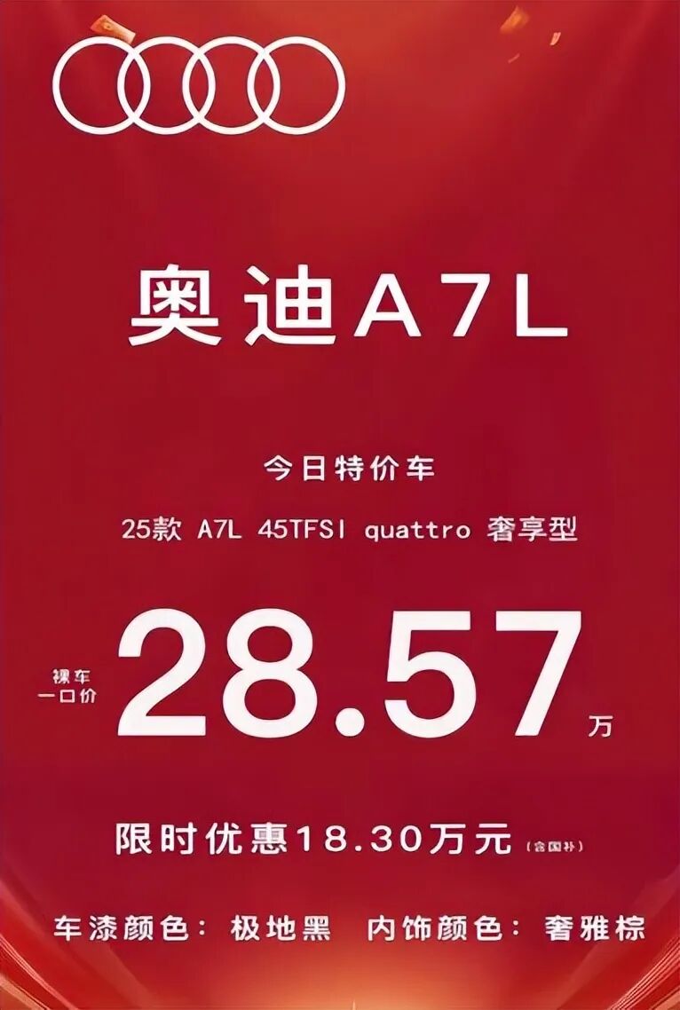 颜值非常在线的奥迪A7L,指导价为45.97万的25款A7L 45TFSI quattro 奢享型,在叠加国补等优惠之后,裸车价也直接下探到28.57万。