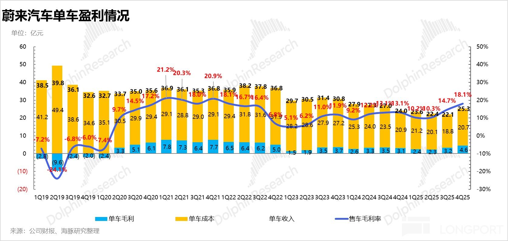 作为每次放榜时候最为关键的指标,我们先来看看蔚来的卖车盈利能力: