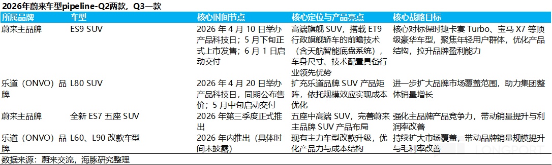 ② 蔚来 ES9:5 月上市,6 月交付。作为旗舰 SUV,定位相比 ES8 更高(5.4 米车长、ET9 技术下放,BaaS 后预计 40-45 万元),有望一定程度上复刻 ES8 的成功,再打造出 40 万以上市场的爆款。