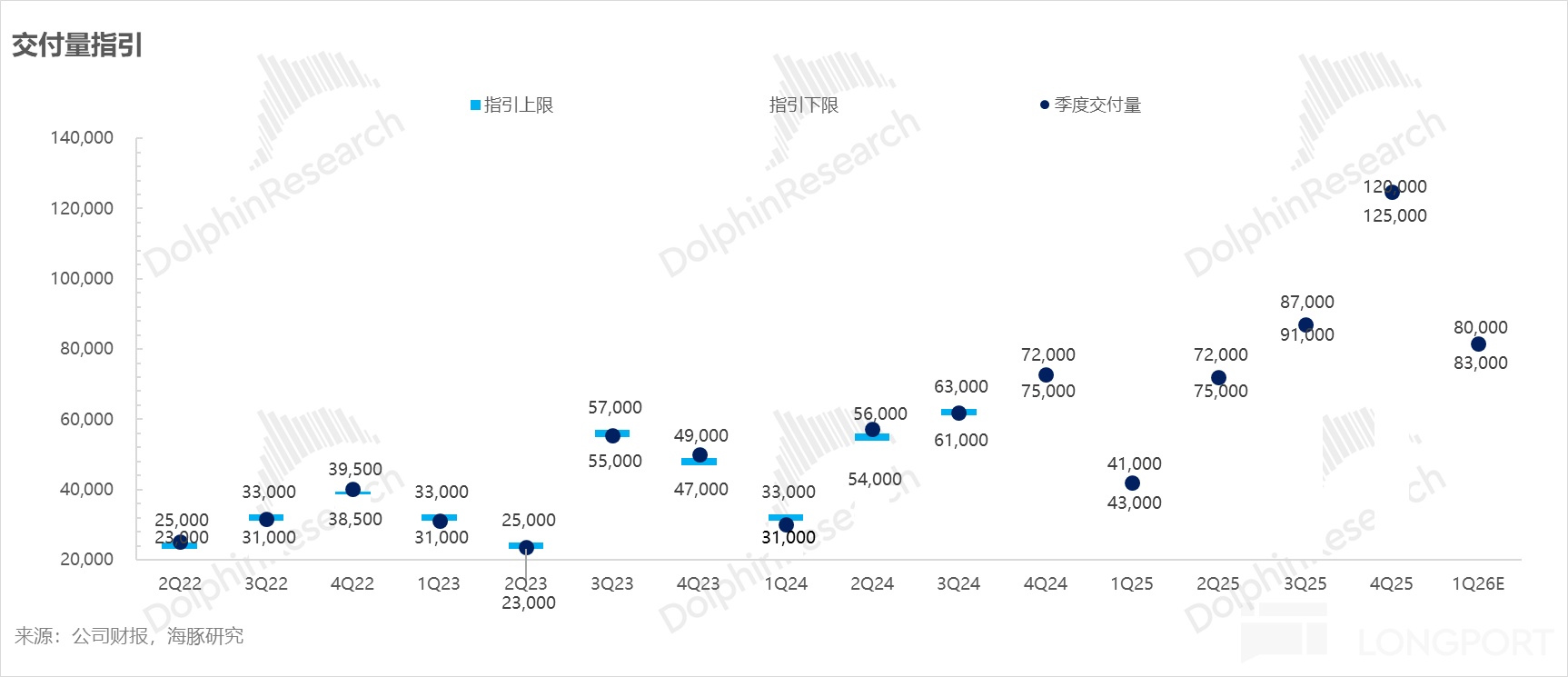 结合已公布的 1、2 月实际交付数据(分别为 2.7 万和 2.1 万辆),对应隐含的 3 月销量约为 3.2 万-3.5 万辆。尽管 3 月表现相比 2 月的低谷(受春节效应叠加退坡冲击影响)将迎来明显的环比回升,但一季度 8-8.3 万辆的总指引,依然低于市场 8.9 万辆的普遍预期。