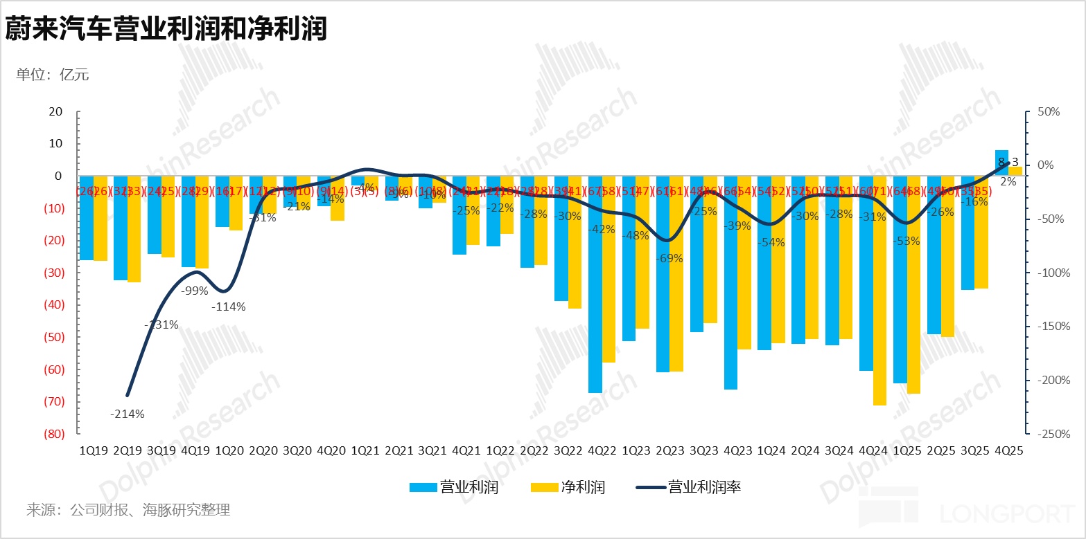蔚来于北京时间 2026 年 3 月 10 日美股盘前,港股盘后发布了 2025 年第四季度财报,蔚来实现了上市以来首次扭亏,终于甩掉了万年巨亏的标签,具体来看: