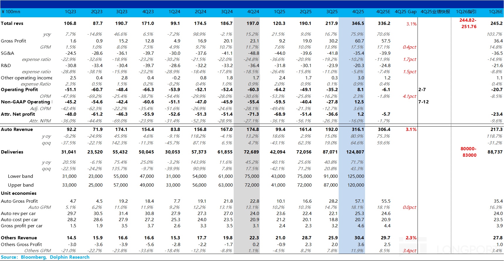 但对于 2026 年全年销量方面, 虽然蔚来能享受到 BasS 模式下对于购置税退坡的一定缓冲,以及车型 pipeline 相对强劲,但在整体新能源车行业销量预计仅同比增长 5%-15% 的预期下,管理层给出的 40%-50% 的同比增长至 46-50 万辆,海豚君对于这个乐观的销量指引也只能边走边看。