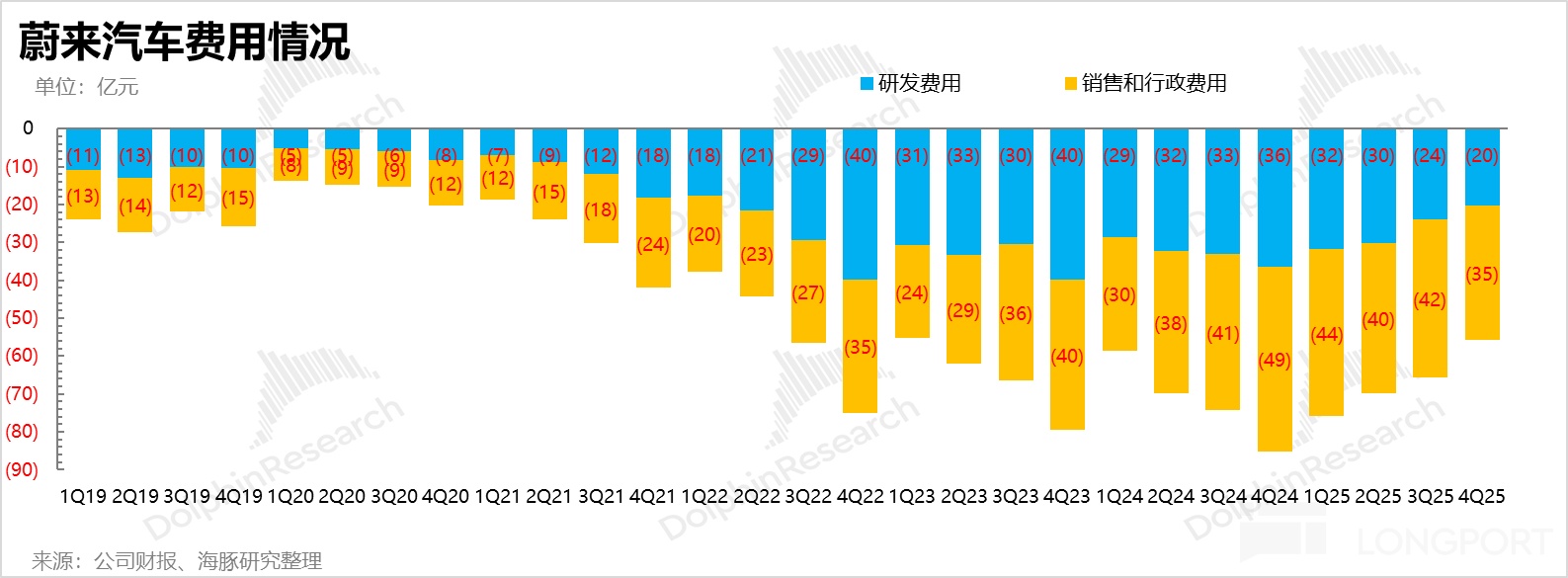 但现在单独铺渠道的乐道已经并入了蔚来主品牌,形成渠道共用,而蔚来也对销服团队的大规模裁员,以及营销费用投入有所减少,四季度未来的销管费用仅 35.4 亿元,环比下滑 6.5 亿,大幅低于蔚来之前指引的 40 亿元。