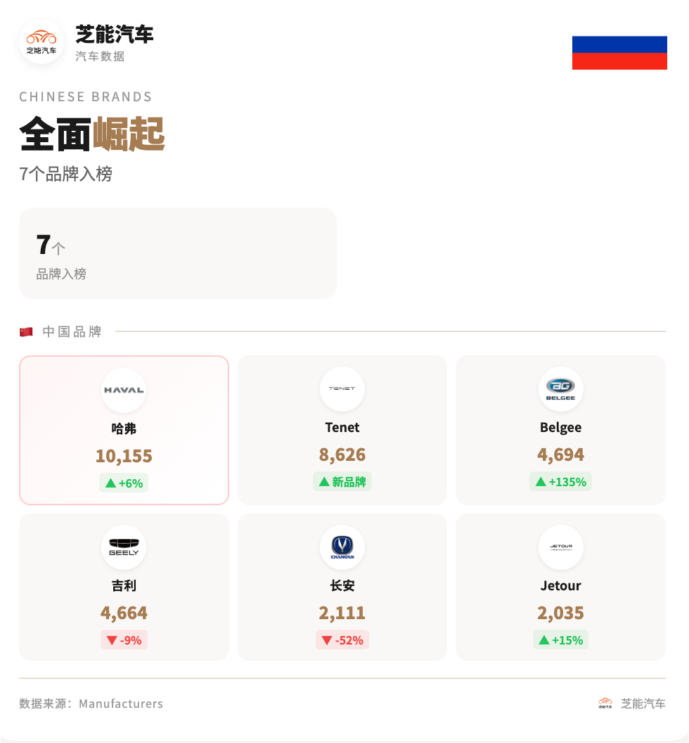 ◎ 排名第二的是 哈弗,当月销量10,155辆,同比增长6.1%,市场份额达到12.7%,成为俄罗斯市场最成功的中国品牌之一。