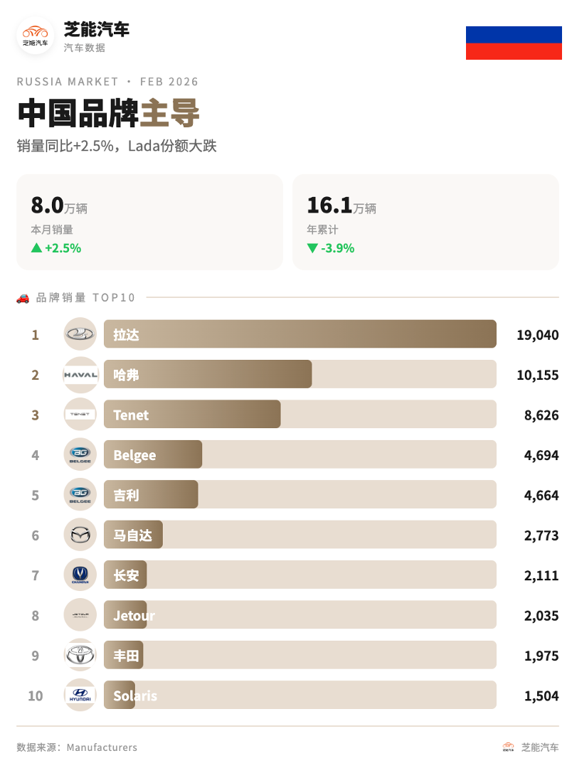 ◎ 俄罗斯本土品牌 拉达依然是市场第一。2月销量为19,040辆,不过同比下降22.5%,市场份额从去年的31.5%降至23.8%。虽然仍然保持领先,但优势正在明显缩小。