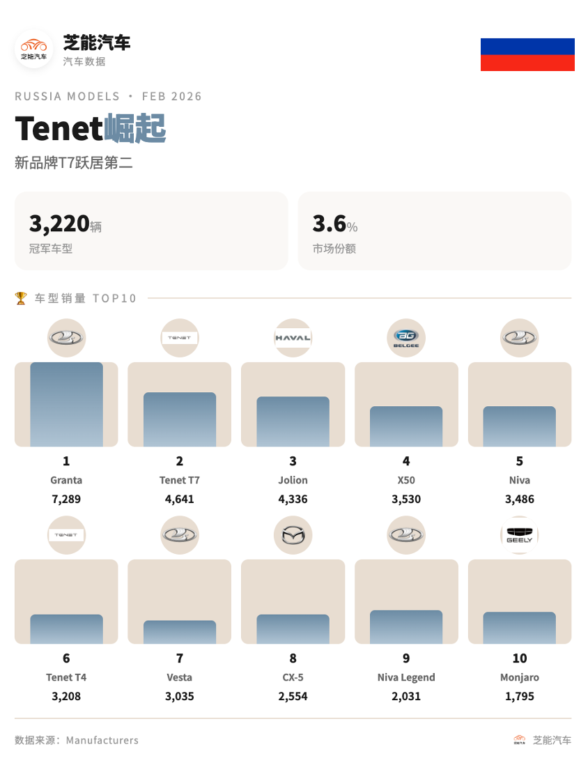 ◎ 今年最受关注的新品牌是 Tenet。该品牌2月销量达到8,626辆,市场份额达到10.8%,一举进入销量榜第三位。Tenet实际上是奇瑞在俄罗斯推出的本地化品牌,主要在卡卢加工厂生产。