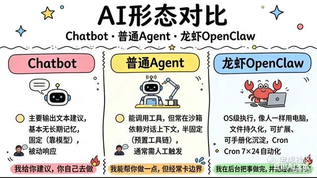 普通AI需要动嘴,比如豆包、ChatGPT,你问它答,全程在对话框里。而OpenClaw长了“钳子”,在获得授权后,它能全天候操作鼠标键盘、读写文件、发送邮件、整理文档。