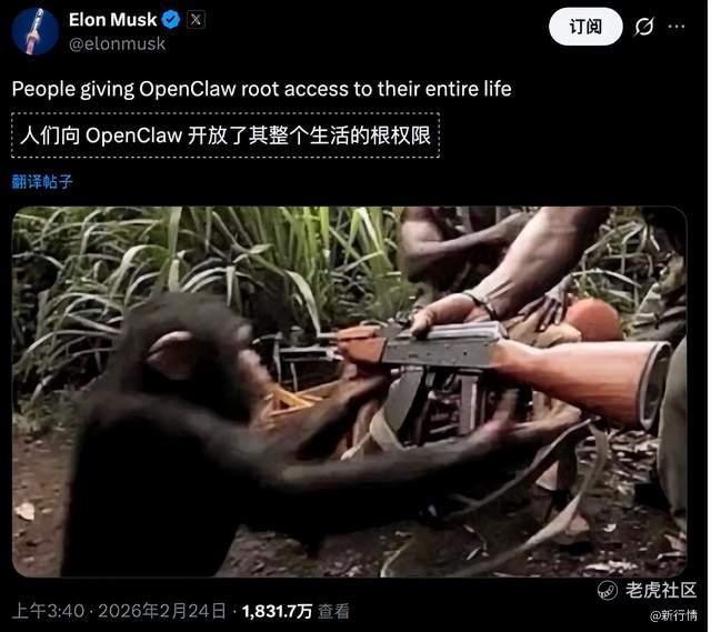 马斯克发布了一张“士兵把AK枪递给猴子”的照片,并配文表示:“人们向OpenClaw开放了整个生活的权限”,讽刺意味拉满了。