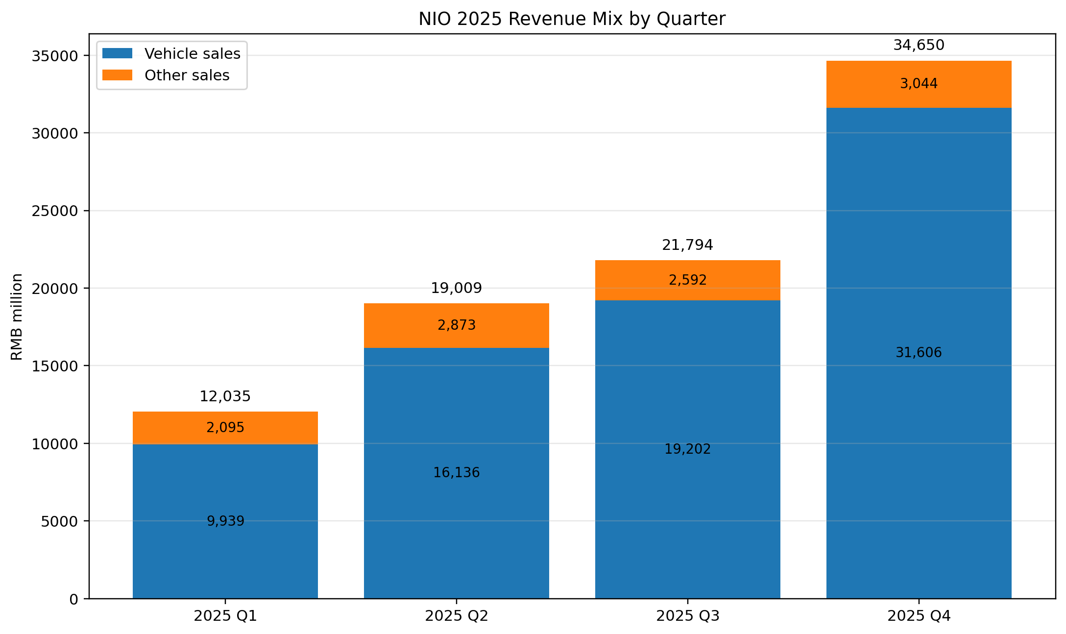 如果说盈利转正只是让市场看到了结果,那么真正让市场愿意相信这份结果的,是利润背后的结构也在同步改善。四季度,蔚来综合毛利率达到17.5%,较2024年同期的11.7%提升5.8个百分点,较三季度的13.9%提升3.6个百分点;整车毛利率达到18.1%,较上年同期的13.1%提升5个百分点,较三季度的14.7%也提升了3.4个百分点。更直接地看,四季度毛利润达到60.7亿元,同比大增163.1%,而成本增速仅为64.3%,明显低于收入增速75.9%。这说明利润改善并不是利润表表面数字变好,而是收入与成本之间的关系出现了实质性优化。更值得注意的是,公司对毛利率改善的解释也很明确,核心来自交付与收入增长更强、产品组合更加优化,以及降本增效持续推进。公司CFO还特别提到,四季度其他销售毛利率也达到11.9%。这意味着,改善并不只来自卖车本身,售后服务、零部件、技术研发服务等非整车收入也在变得更有贡献。四季度其他销售收入30.44亿元,同比增长36.6%;全年其他销售收入106.0亿元,同比增长41.4%。对一家用户基盘不断扩大的车企来说,这类收入的增加,往往意味着盈利结构正在从单纯依赖整车销售,逐步走向整车销售与服务生态共同支撑。