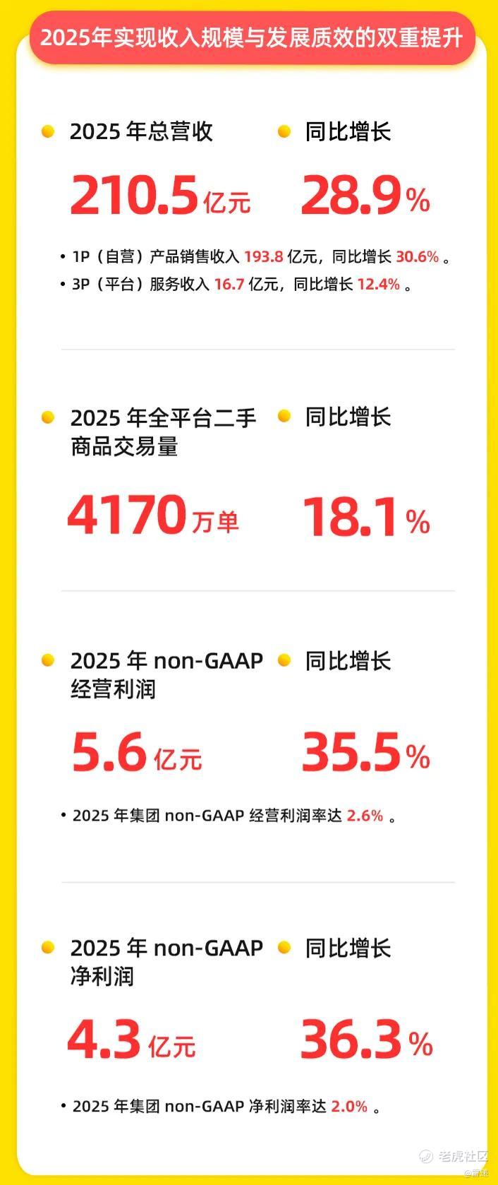 万物新生首席财务官陈晨表示:“万物新生集团以第四季度的表现为2025年画上圆满句号。第四季度的non-GAAP经营利润同比增长38.1%至1.8亿元,季度利润表现继续改善,体现了规模效应和精细化运营带来的效率提升。展望2026年,我们期待通过扩大可覆盖的潜在市场与履约交付范围,进一步拓展二手手机3C业务大盘的成长空间,通过创新的平台模式服务用户多样化的回收交易需求,持续打造二手行业经营典范,并扎实提升经营效率。”