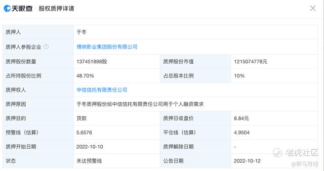 此外,2022年,于冬还曾将其持有的1.37亿股博纳影业股份质押给中信信托,用于满足个人融资需求。
