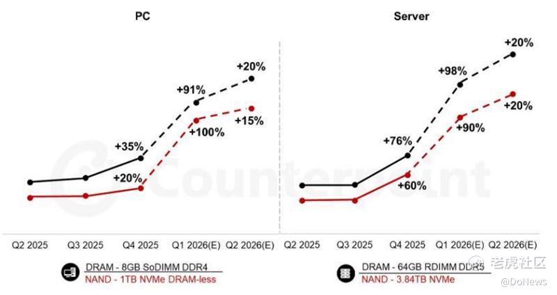 由于AI厂商疯狂撒钱,内存芯片的价格已经被炒上了天。Counterpoint Research发布的《2月内存价格追踪报告》显示,2026年第一季度,内存价格环比上涨80%-90%,同比甚至已经涨了三四倍,其中DRAM、NAND及HBM价格均创下历史新高。