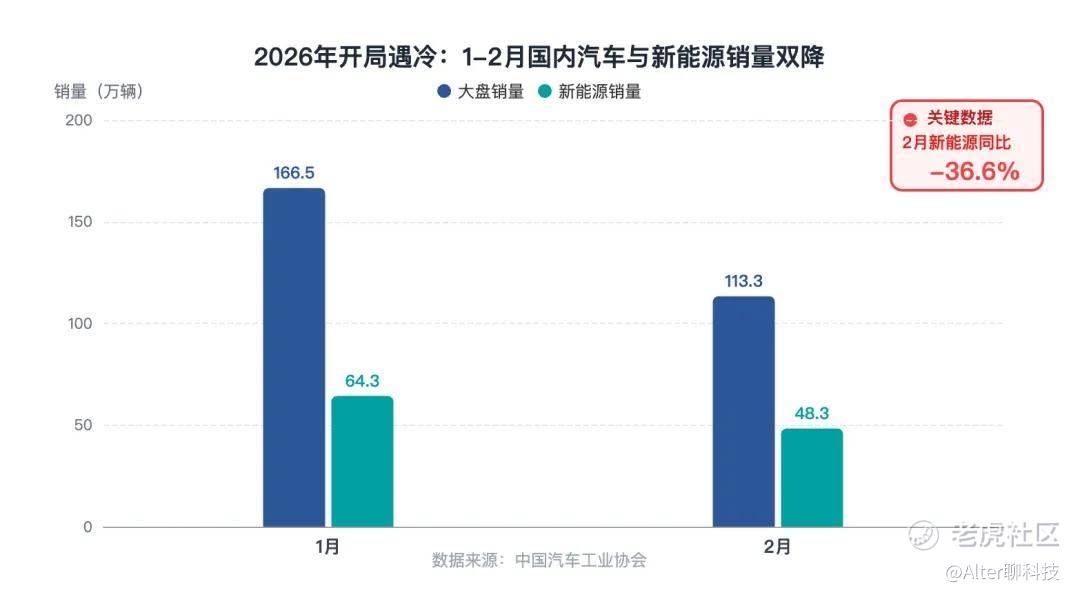 中国汽车工业协会的数据显示,2026年1月国内汽车销量166.5万辆,同比下滑14.8%,其中新能源汽车的销量64.3万辆,同比下降约19%;2月国内汽车销量113.3 万辆,同比下降32.9%,新能源汽车销量48.3万辆,同比下滑幅度高达36.6%。
