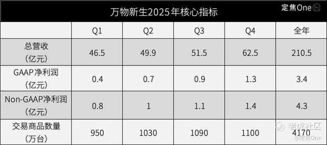 拉长时间线来看,这一转折不算突然。自2024年Q3首次实现单季度GAAP盈利后,万物新生的财务数据逐步改善,2025年四个季度营收分别达46.5亿元、49.9亿元、51.5亿元、62.5亿元;利润从Q1的0.4亿元逐季升至Q4的1.3亿元,呈现出稳定爬坡的走势。