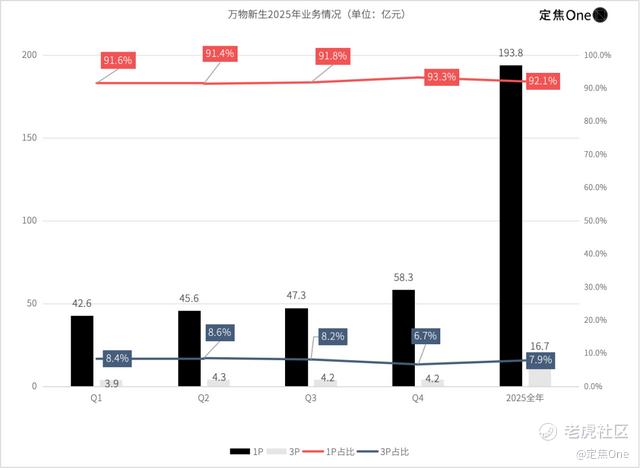 2025年全年,万物新生总营收达210.5亿元,其中1P自营业务收入193.8亿元,占比高达92.1%,且四个季度营收占比均超九成;3P服务业务收入16.7亿元,同比增长12.4%,虽为高毛利辅助板块,但规模占比仅7.9%,尚未形成能与1P并行的第二增长曲线。