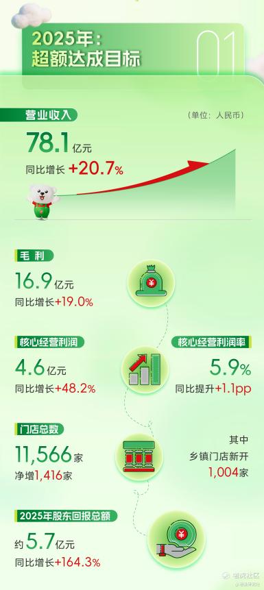 截至2025年末,公司门店总数达11566家,全年净增1416家,其中乡镇市场净增1004家,乡镇店总数达3010家。注册会员数量增至6490万名,同比增长57.1%;预付卡预存金额达12亿元,同比增长22.3%。
