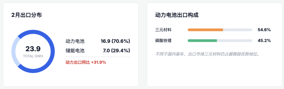 动力电池出口的增速尤其值得注意——2月单月同比增长31.9%,1-2月累计同比增长44.6%,明显高于同期国内装车水平。