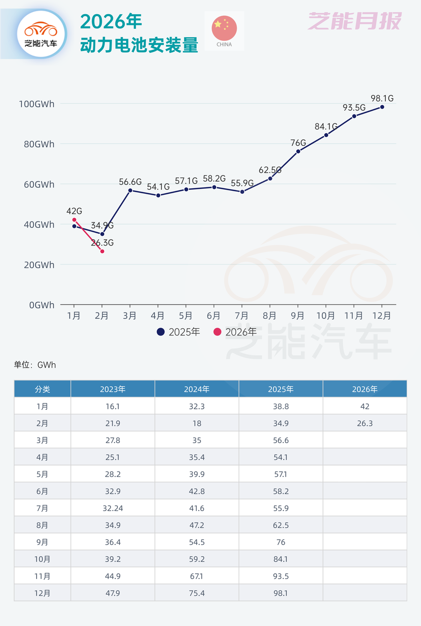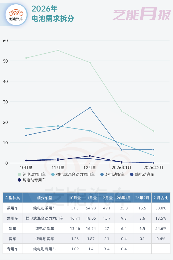 每年过春节的2月,对电池行业来说都不是一个热闹的月份。春节叠加车市淡季,车厂停线、物流减速、订单延后,产业链整体踩一脚刹车。但今年2月的数据有点不一样,终端装车在降,产量、储能和材料需求却仍在高速增长。