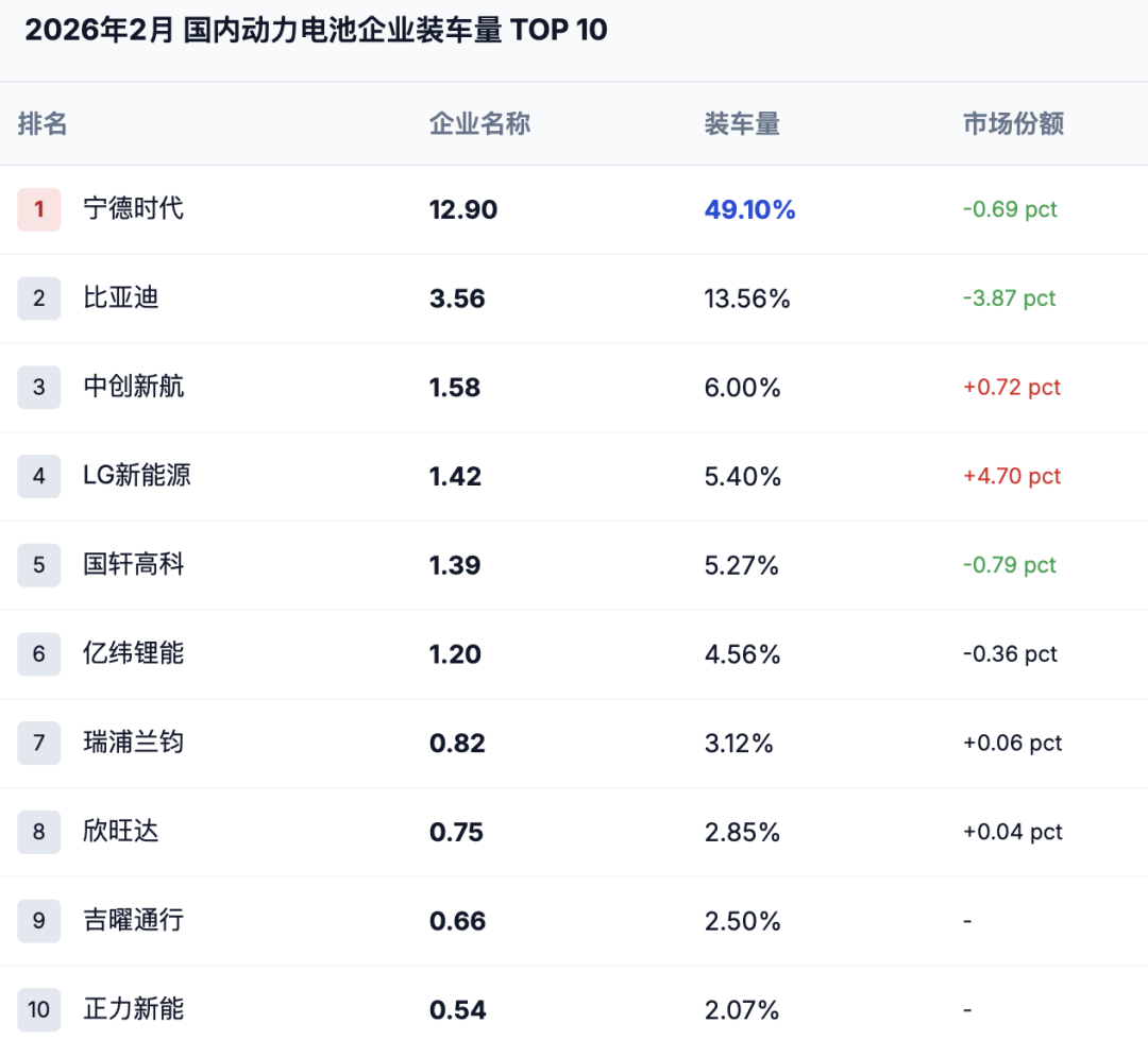 比亚迪份额则同比下降7.3个百分点。原因并不复杂:比亚迪电池主要自供,1-2月国内装车量比较少,所以变化就很明显。