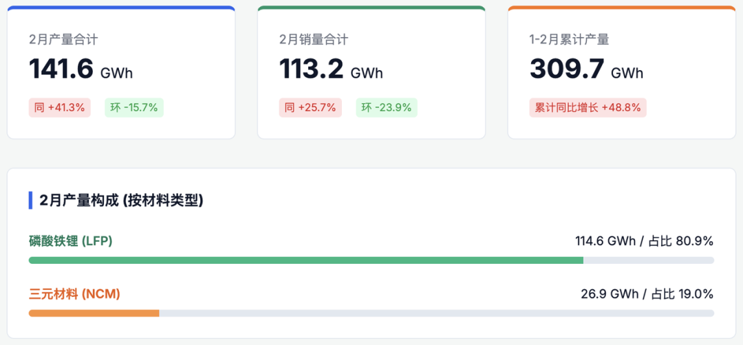 ◎ 先看最核心的数字。2026年2月,中国动力和储能电池总产量141.6GWh,同比增长41.3%;1-2月合计309.7GWh,同比增长48.8%。