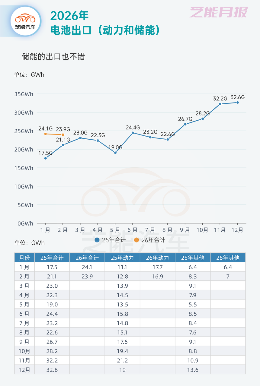 ◎ 2026年2月,中国动力和储能电池合计出口23.9GWh,同比增长13.2%;