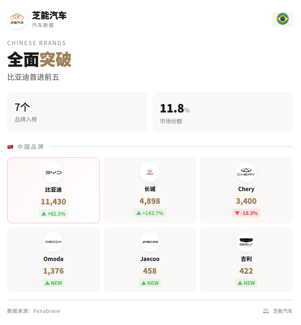 ◎ 比亚迪:销量11,430辆,同比增长62.5%,份额达到6.5%,继续稳居巴西第五大汽车品牌。