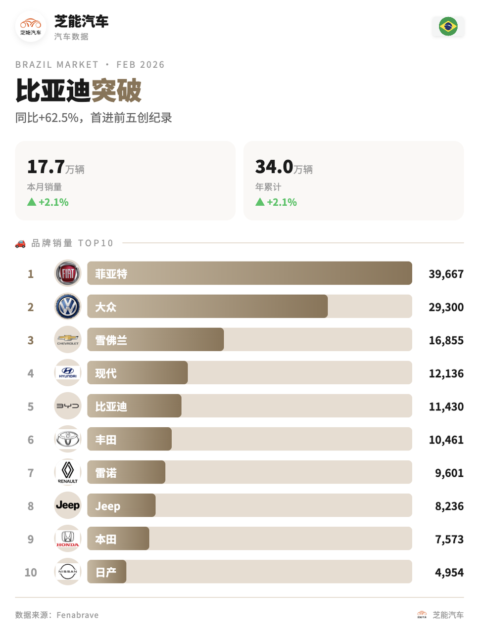 中国品牌的存在感正在快速提升,2月比亚迪销量达到11,430辆,同比增长62.5%,市场份额升至6.5%,刷新其在巴西市场的历史份额纪录。