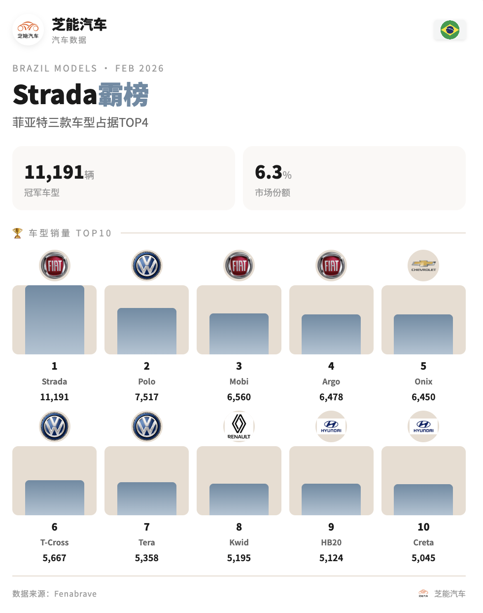 ◎ 销量排名第一的仍然是菲亚特Strada,2月销量达到11,191辆,市场份额6.3%。这款小型皮卡已经多年占据巴西销量冠军。