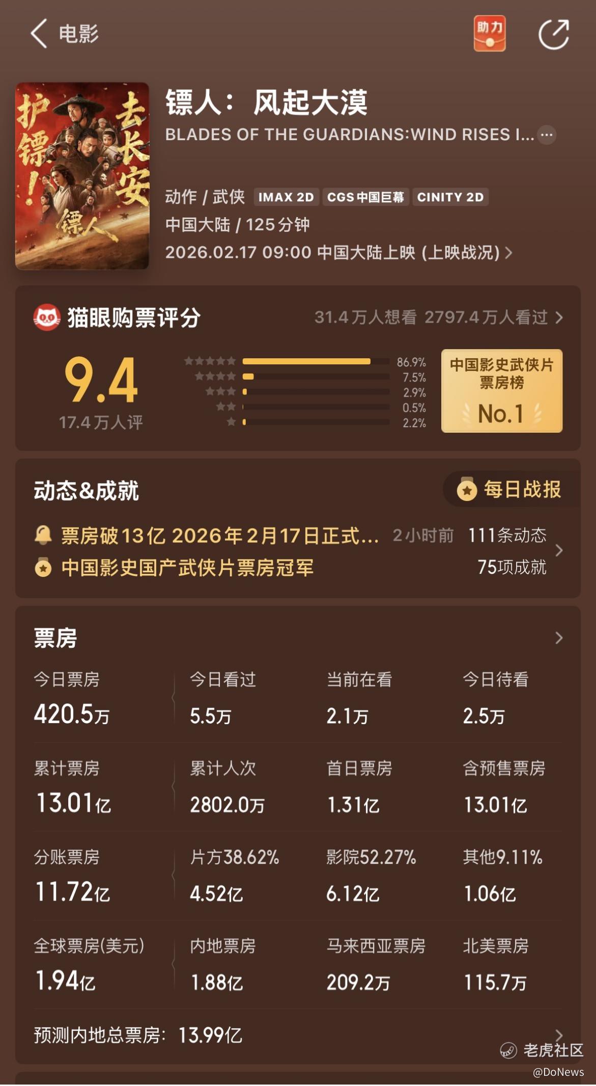 从春节档几部影片的出海情况来看,《镖人》的表现最为亮眼。最新数据显示,其北美票房达到833.18万元,超越《英雄》跻身全球武侠票房第二,仅次于《卧虎藏龙》,在马来西亚、印尼、新加坡登顶周票房冠军,烂番茄上获得了93%的新鲜度和97%的观众爆米花指数,评分人数在200人上下。