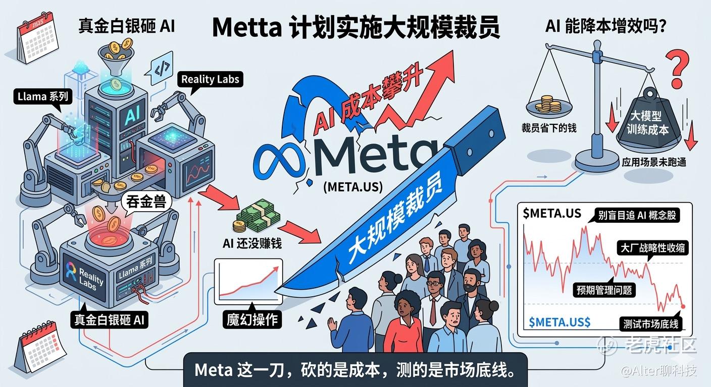 $META(META.US)$ 这次的逻辑很有意思:AI投入产出周期太长,股东没耐心等,那怎么办?裁员降本呗——反正资本市场就吃这一套。但仔细想想,Meta在AI上可是真金白银砸了不少,Llama系列、Reality Labs,哪个不是吞金兽?结果AI还没赚钱,先把搞AI的人裁了,这操作确实有点魔幻。