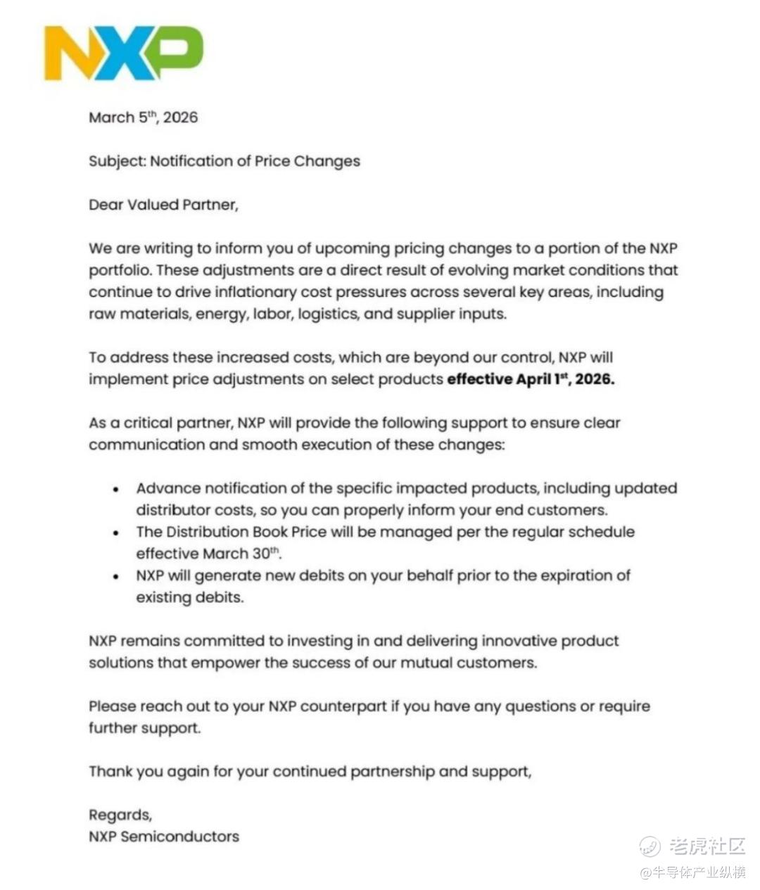 全球模拟芯片大厂恩智浦近日也发布了涨价函,官宣自2026年4月1日起对部分产品调价。此次调价系受原材料、能源等多环节成本上涨影响,同时将提供多项支持保障调价顺畅执行。