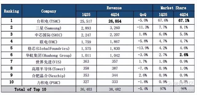 2025年Q1晶圆代工厂市场格局(来源:TrendForce)