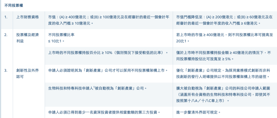 与此同时,如果公司上市时市值达到400亿港元,WVR投票权比例上限可从10比1放宽到20比1;在特定条件下,WVR持股的最低经济利益要求也可由10%放宽到5%,前提是持股金额至少达到40亿港元。