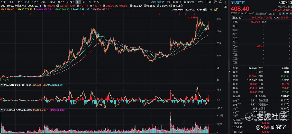 在披露年报的同时,“宁王”也发布了2025年利润分配预案,拟以4,531,886,650股为基数,向全体股东每10股派发现金分红69.57元(含税),合计分红约315.32亿元。事实上,过去三年,宁德时代已累计分红近千亿元。截至3月16日收盘,宁德时代报收于408.4元/股,动态PE为25.8倍,总市值为1.89万亿。