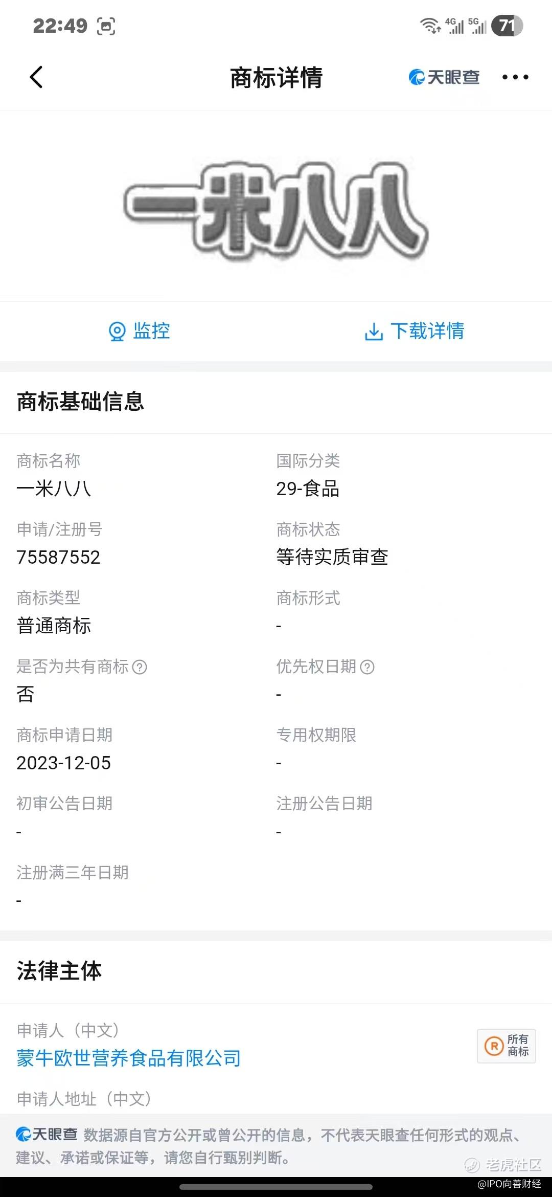 天眼查APP商标信息显示,“一米八八”商标的所有人为蒙牛欧世营养食品有限公司。